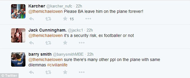 Jack Cunningham weighed in with: 'it's a security risk, ex footballer or not ,' while Karcher got personal with his comment of: 'Please BA leave him on the plane forever!'